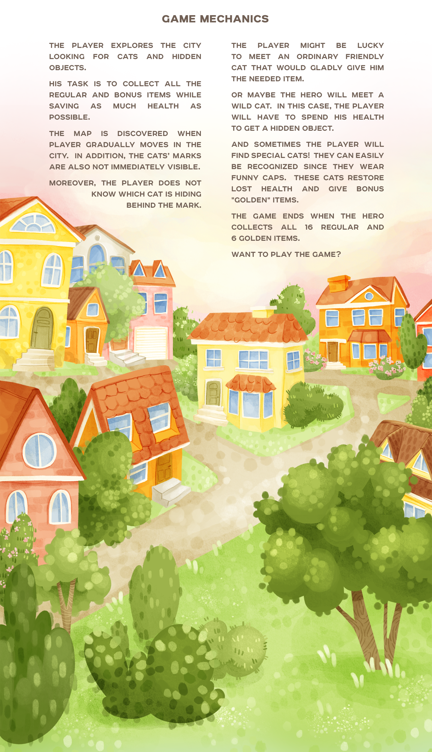 Kitty City is a mobile game concept for all cat lovers. Start exploring the city and collect all the items that cats are hiding from you!
